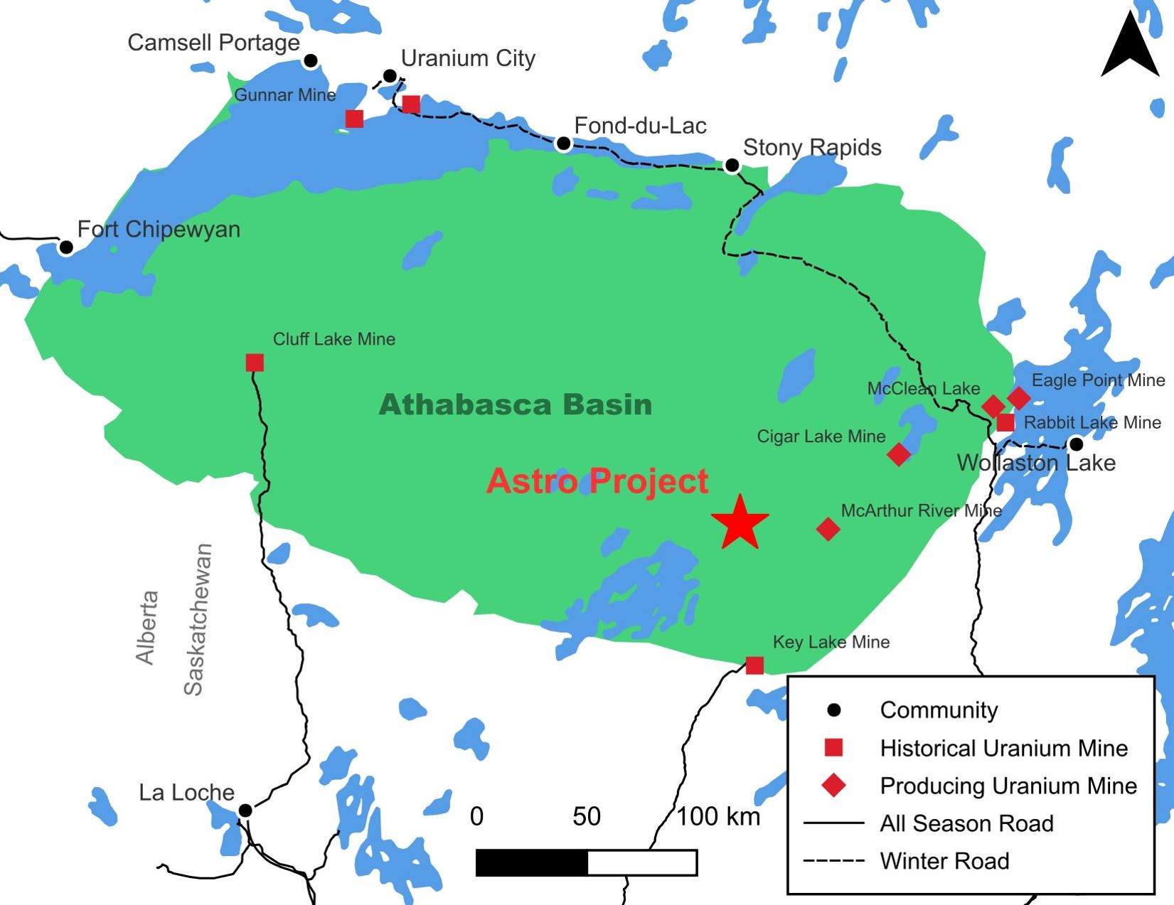 The Astro property is situated 28 kilometers west of the McArthur River Mine, 17 kilometers west of the Fox Lake Deposit, and 13 kilometers north of the Millennium Deposit.