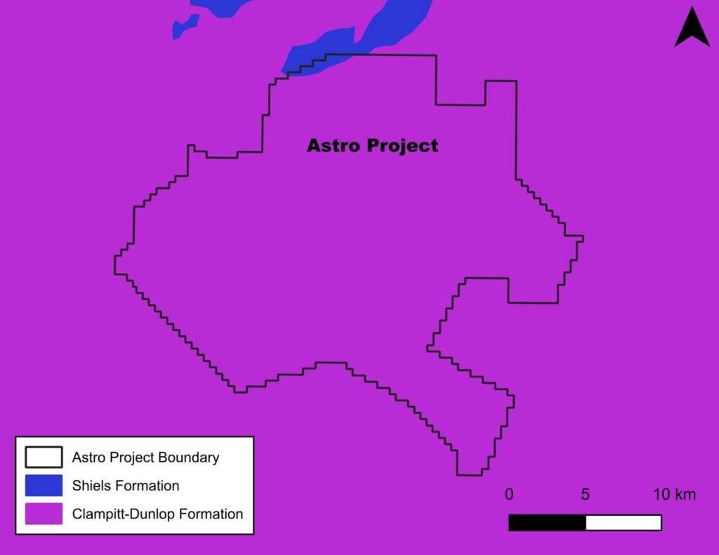 Figure 2: Geological map of the Astro project. Mineralization is being explored for at the unconformity contact