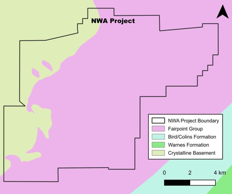 Figure 2: Map of geological units on the NWA project. Sandstone mineralization has been historically discovered in the area; modern exploration is searching for Unconformity and Basement mineralization.